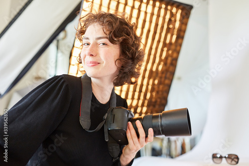 Professionelle Fotografin mit Muskel Armen als Konzept