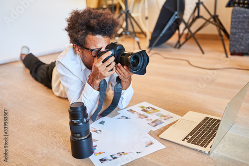Junger Fotograf im Fotostudium prüft Kameramodus
