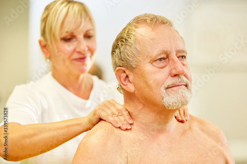 Senior Mann mit blauem Kinesio Tape an der Schulter