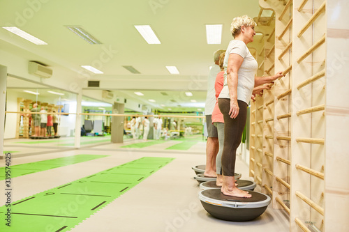 Gruppe Senioren bei Physiotherapie auf Bosu Ball