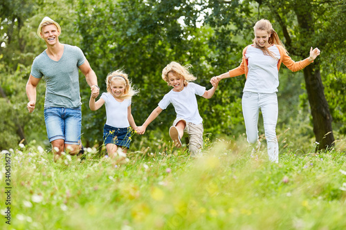 Familie und Kinder laufen über eine Wiese