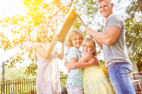 Familie zeigt bunte Zeichnung mit Eigenheim