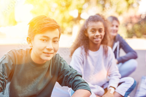 Children sit on schoolyard or in childrens leisure