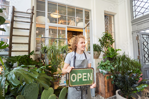 Florist with open sign for the opening of the garden center