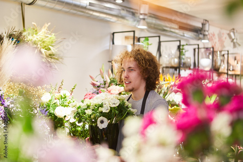Junger Mann als glücklicher Florist im Blumenladen