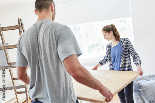 Junge Frau trägt mit ihrem Freund eine Tischplatte