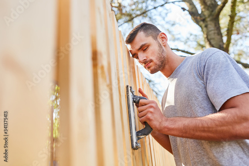 Paar mit Schleifmaschine beim Zaun abschleifen