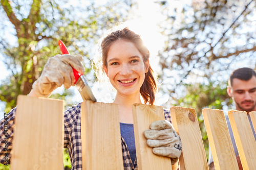 Paar mit Schleifmaschine beim Zaun abschleifen