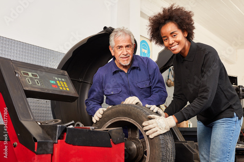 Frau als Mechatroniker Lehrling bei der Reifenmontage