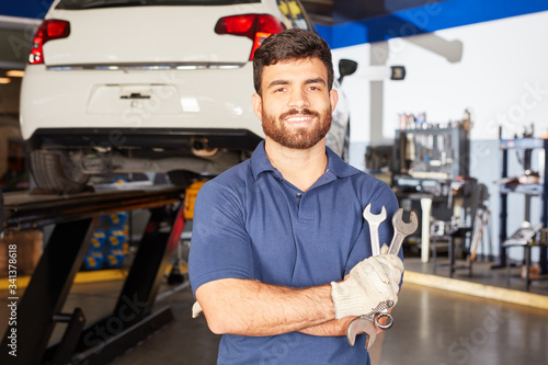 Mechatroniker mit Werkzeug in KFZ Werkstatt