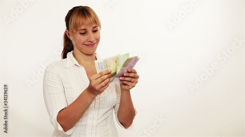 Lachende Seniorin mit Fächer aus Geldscheinen
