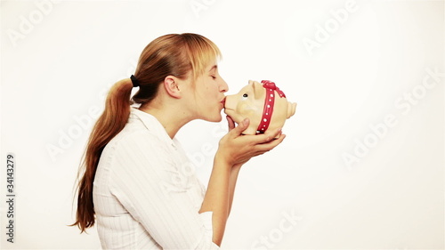 Junge Frau hält Sparschwein als Finanzierung Konzept
