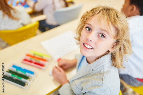Mädchen in Schule steht vor Tafel mit Muskeln