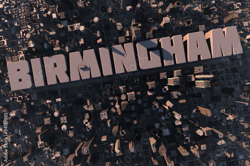 Luftansicht einer Stadt in 3D mit Schriftzug Birmingham