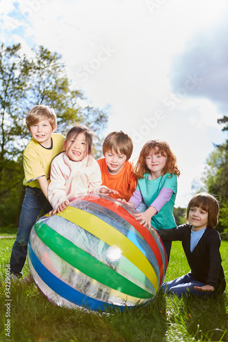 Fröhliche Kinder spielen mit einem bunten Ball