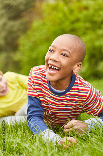 Glückliche Kinder liegen auf Wiese im Sommer
