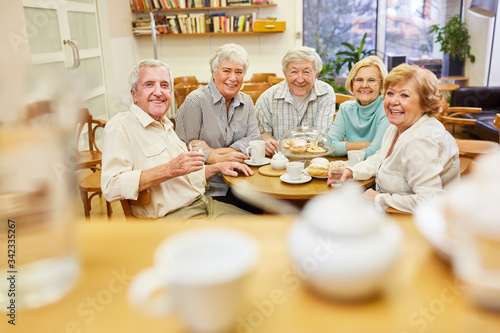 Senioren Gruppe beim Kaffee trinken und Kuchen essen im Seniorenheim