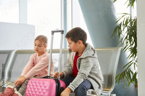 Kinder mit Gepäck im Bahnhof oder Flughafen