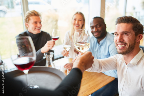 Kellnerin serviert Gästen Rotwein auf Tablett