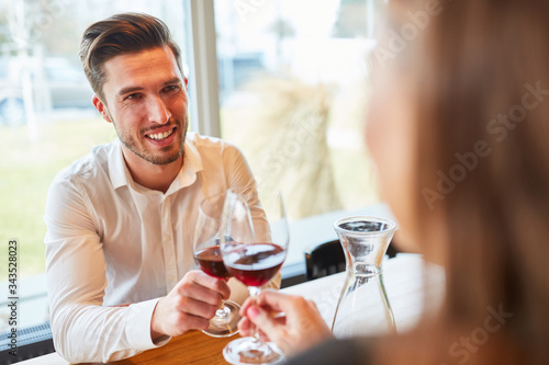 Männer als Freunde umarmen sich beim Wein trinken und stoßen an