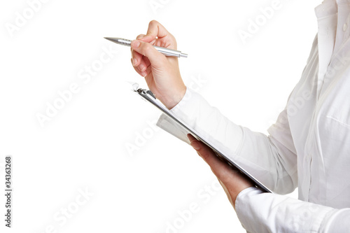 Hände mit Klemmbrett und Stift