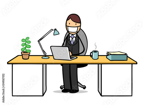 Manager mit Mundschutz arbeitet im Büro am Schreibtisch