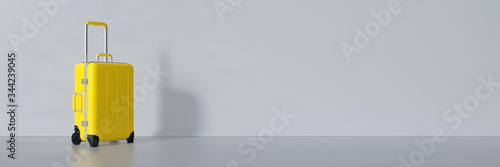 Gelber Koffer vor Wand als Transport und Reise Konzept
