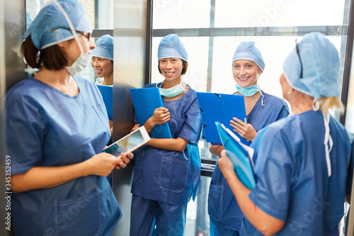 Junge Ärztin in blauer OP-Kleidung mit ihrem Team