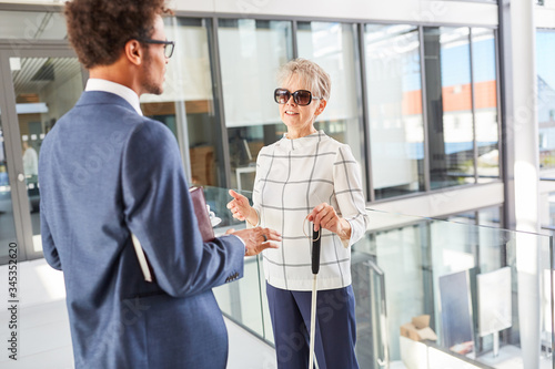 Blinde Frau mit Blindenstock redet mit Geschäftsmann