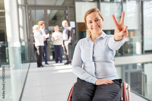 Geschäftsfrau im Rollstuhl macht Victory Zeichen