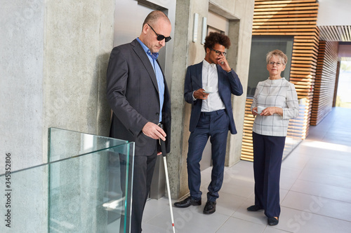Frau im Rollstuhl im behindertengerechten Bürohaus
