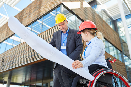 Ingenieur mit Bauplan und Frau als Architekt im Rollstuhl