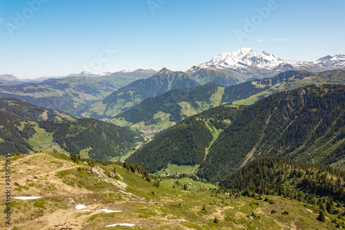 Wide panorama of alpine landscape with snowy mountains and clear sky
