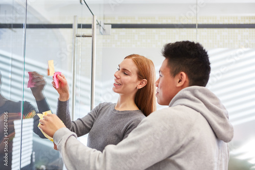 Kreativteam an einer Glaswand mit Haftnotizen
