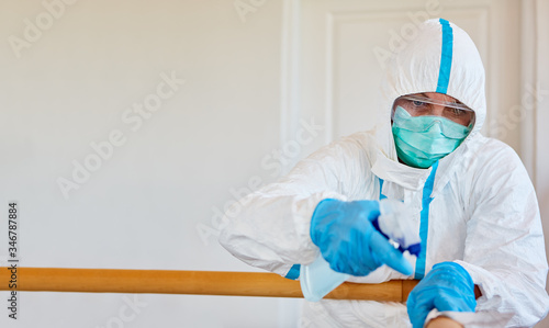 Putzkraft in Schutzkleidung desinfiziert Treppengeländer in Pflegeheim oder Klinik