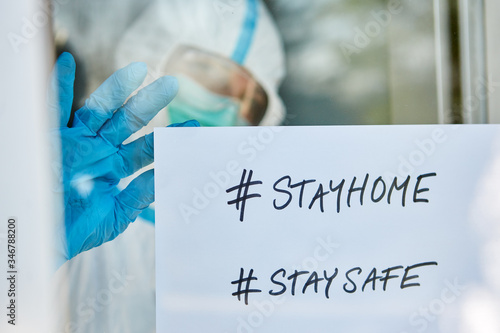 #stayhome #staysafe Botschaft an Tür einer Klinik