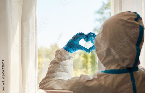 Klinikpersonal hält Herz mit Händen vor Fenster als Coronavirus Unterstützung