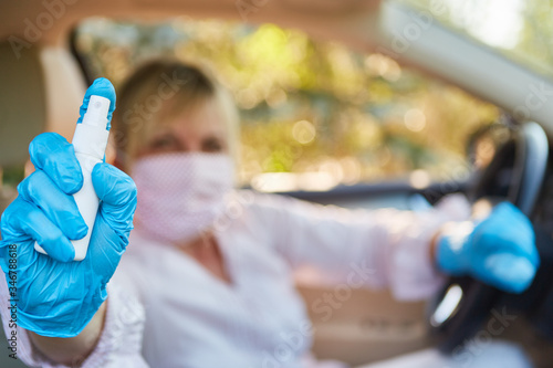 Frau im Auto mit Mundschutz und Desinfektionsmittel oder Reizgas
