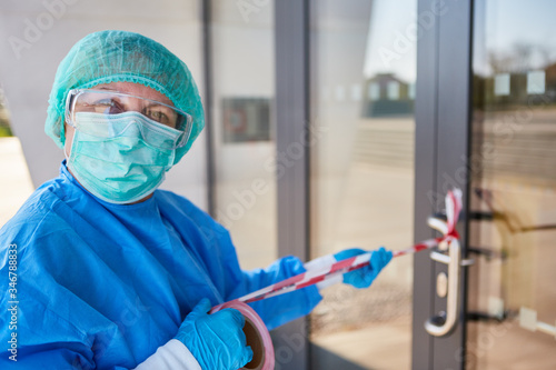 Mediziner befestigt Absperrung an Klinik bei Coronavirus Quarantäne