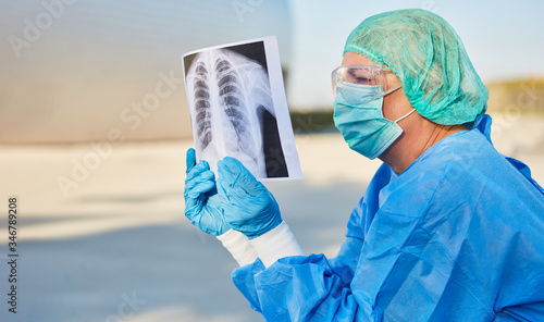 Radiologist studies x-ray of lung of a Covid-19 patient