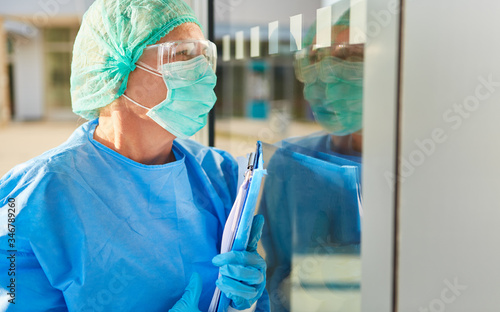 Chirurg vor Klinik schaut durch Tür für Einlass