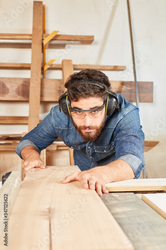 Schreiner Lehrling sägt Holz an der Kreissäge