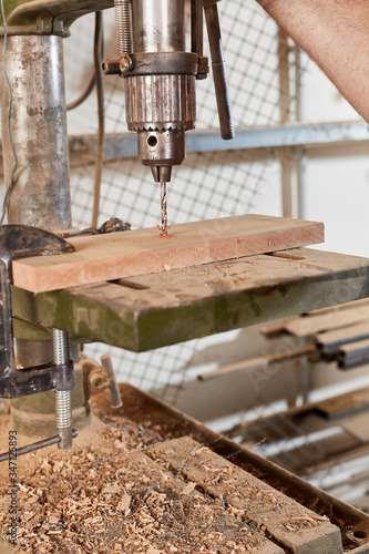 Schreiner bohrt ein Loch in ein Holz Werkstück
