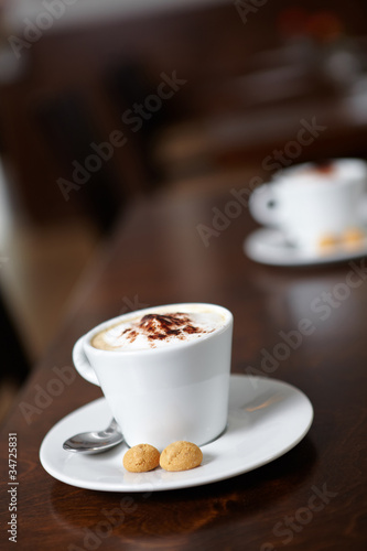 Frische Tasse Kaffee auf Tisch aus Holz mit Kaffeebohnen