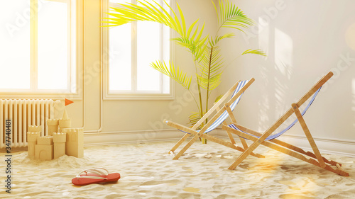 Urlaubsstimmung zu Hause mit Strand im Wohnzimmer