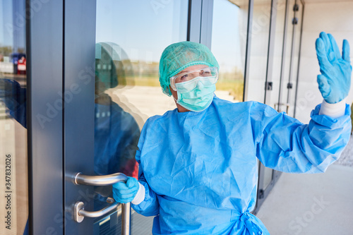Cleaner confident while working in front of a clinic during coronavirus pandemic
