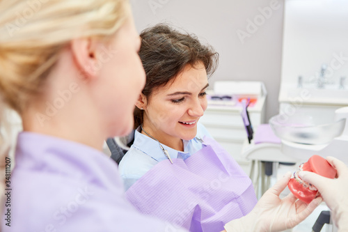 Zahnarzthelferin zeigt Patientin eine Zahnspange