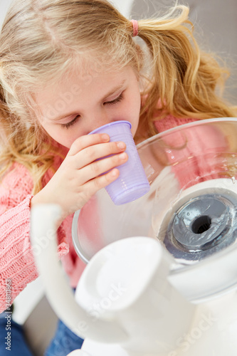 Mädchen beim Zahnarzt mit einem Becher Wasser