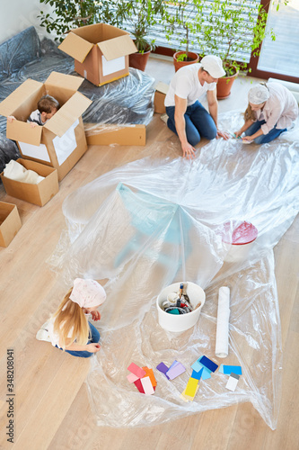 Mutter und Kind mit Schutzfolie bei Renovierung