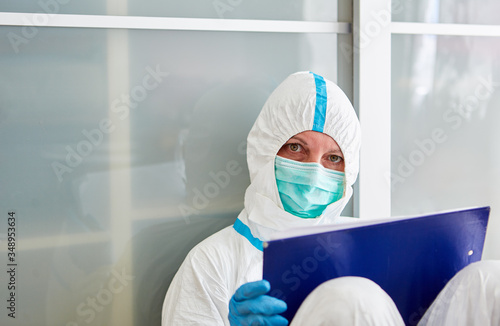 Pflegepersonal in Klinik in Schutzkleidung mit Klemmbrett macht Pause auf Boden